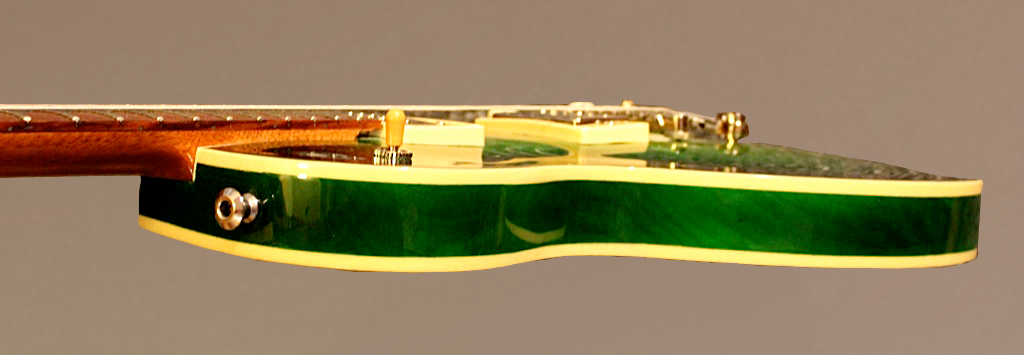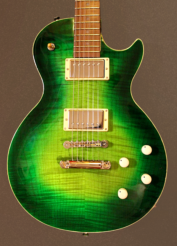 The M5 offers a tone chambered body utilizing: Mahogany back, Maple top, Mahogany neck, Madagascar Kingwood, Maple, or Phenolic fret board, 25.5 scale length with a Gibson fretboard and bridge width. Series parallel switching on both pickups plus the ability to throw the bridge pickups out of phase against the neck pickup. Ivoroid binding front and back on the body plus the neck pocket.